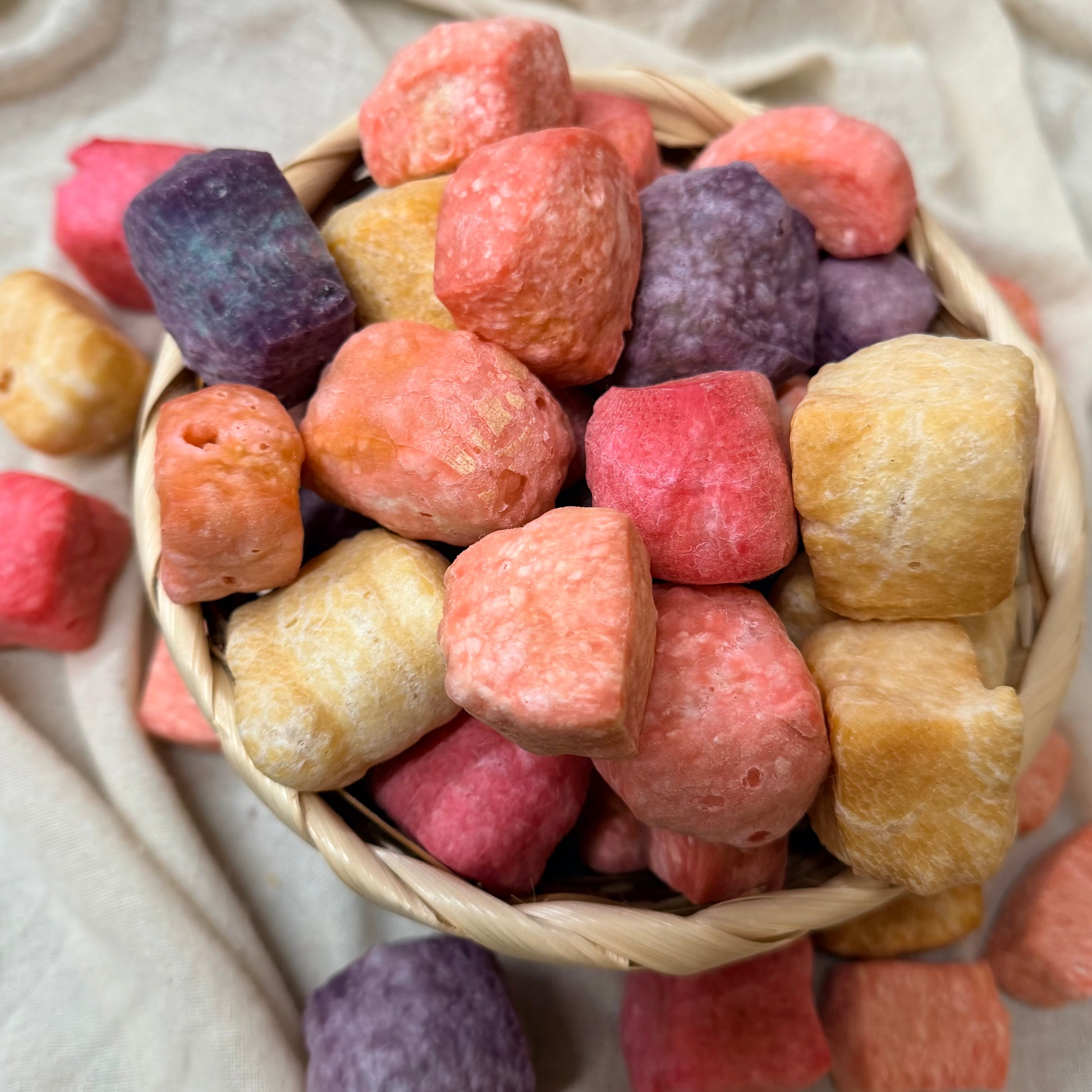 Strawberry, blueberry and original flavour yak puffs! Crunchy and delicious with all the flavour of a yak bar in little puffy clouds.